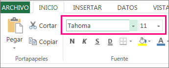 Al introducir datos en una hoja de cálculo, Excel usa automáticamente el estilo de fuente Calibri en size 11 pero, si prefiere un estilo o un tamaño de fuente diferente, se cambia aqui: